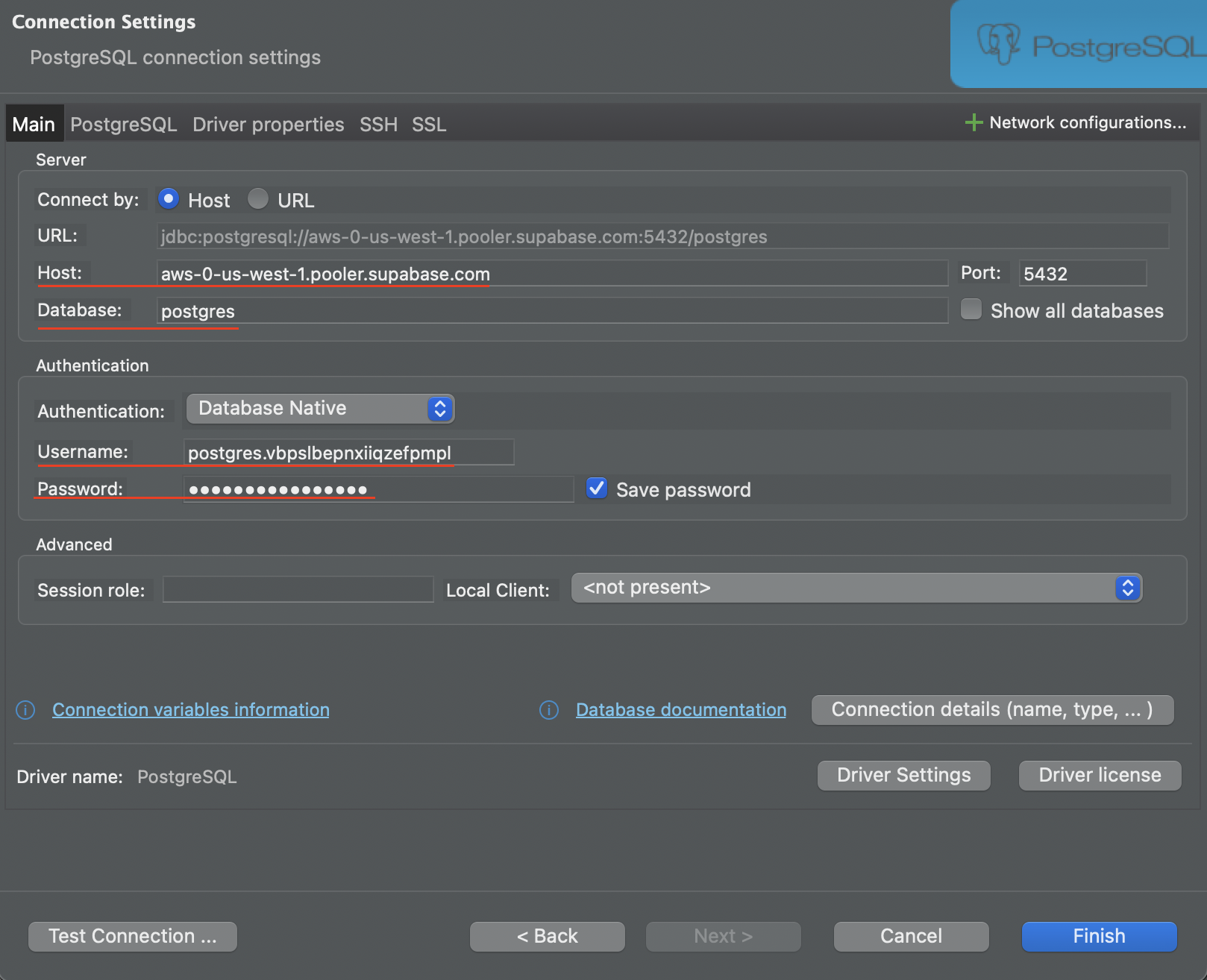 In DBeaver's Main menu, add your host, username, and password