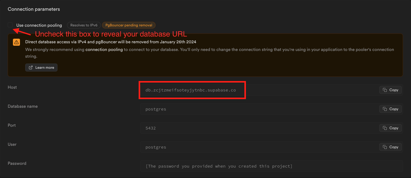 Example Hostname: db.zcjtzmeifsoteyjytnbc.supabase.co